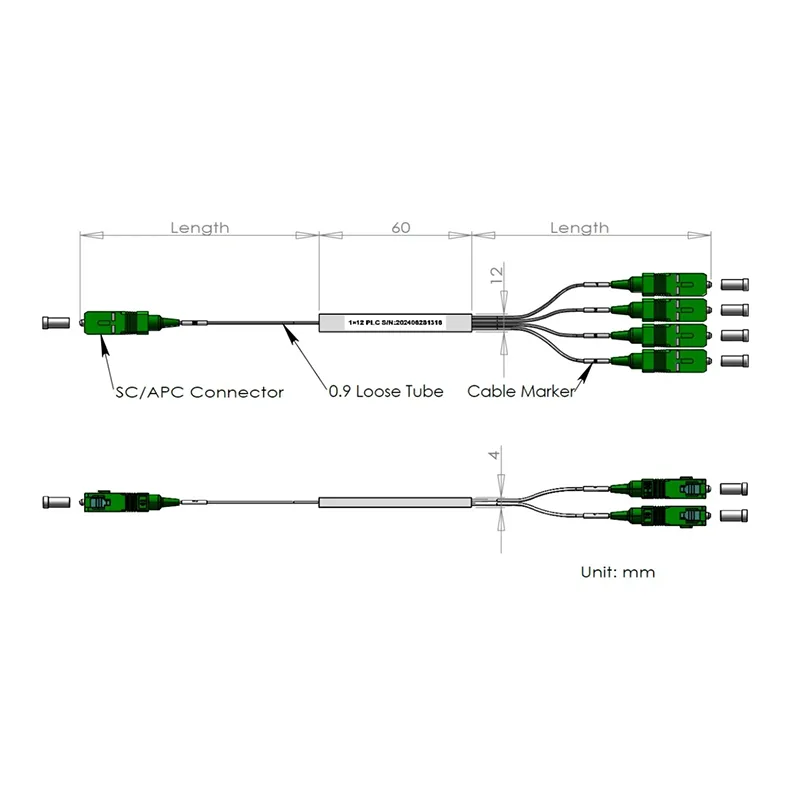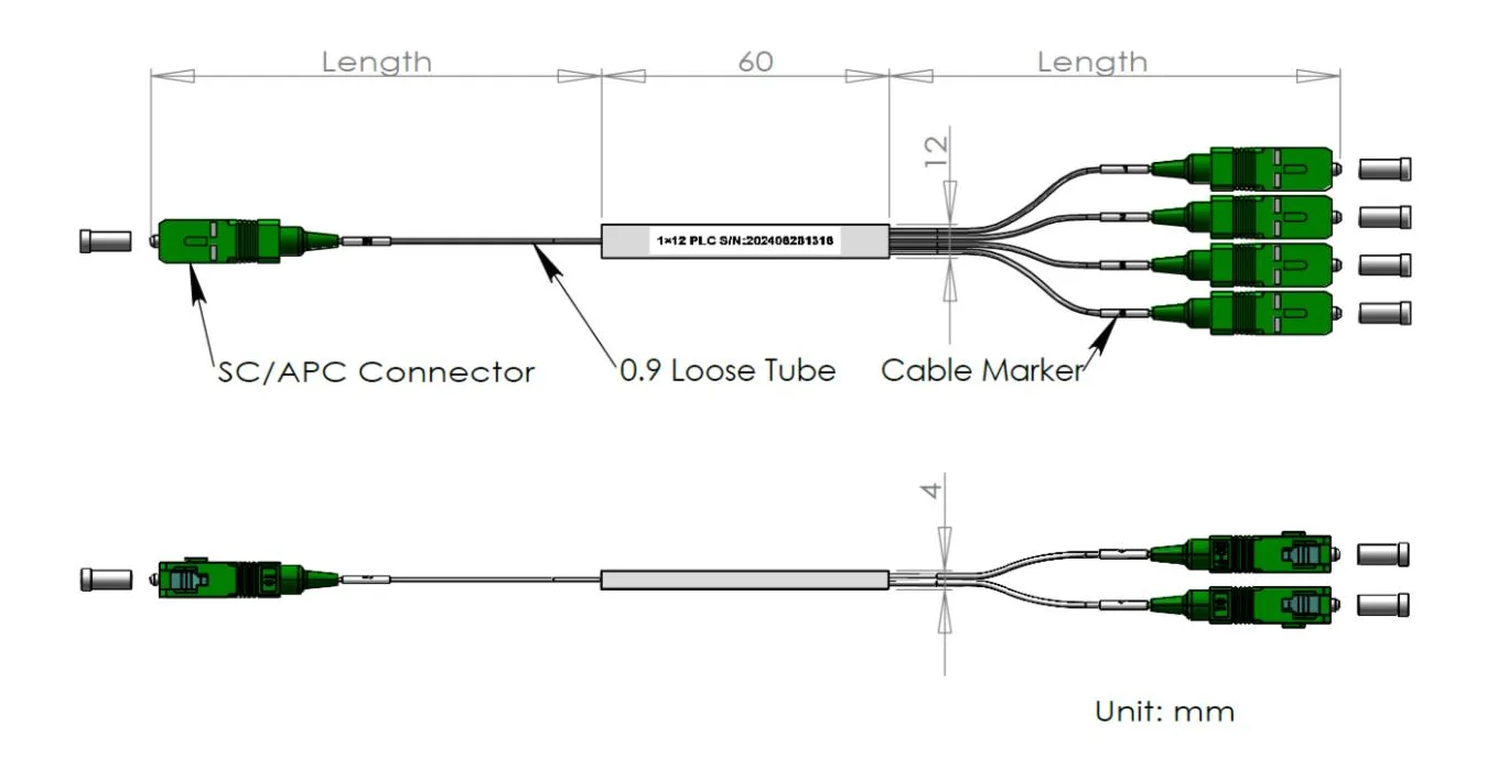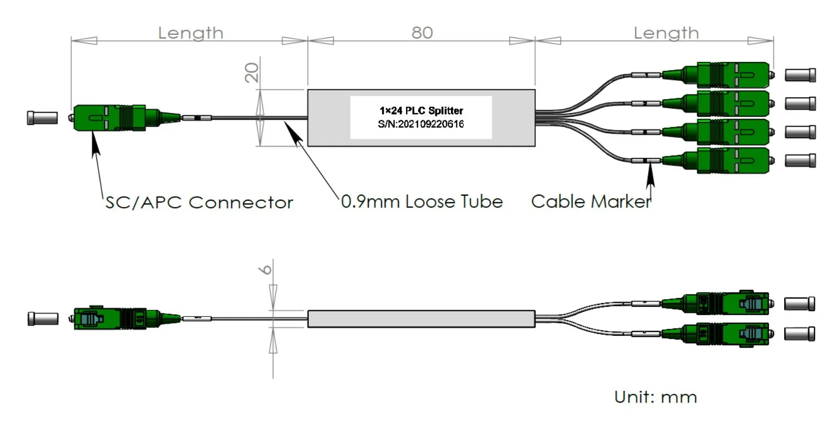 I-1x12 / 1 × 24 PLC Splitter Tube Tube Package 6x12X4 ne-80x20x4mm, nge-900μm tube okuxekethile ishubhu 1.0 + 0.1 /-isixhumi se-SC / APC.