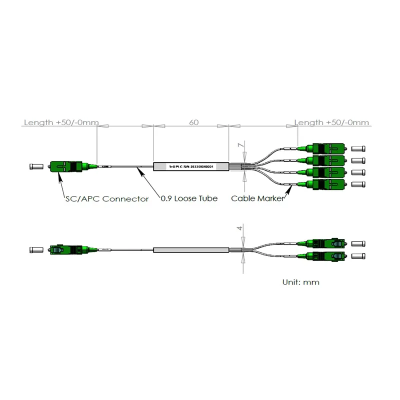 1 × 8 8 PLC Splitter Tube Tube Package 60x7x4mm, nge-900μm tube okuxekethile 1.0 ne-0.75 + 0.055 / -0M, Isixhumi se-SC / APC.