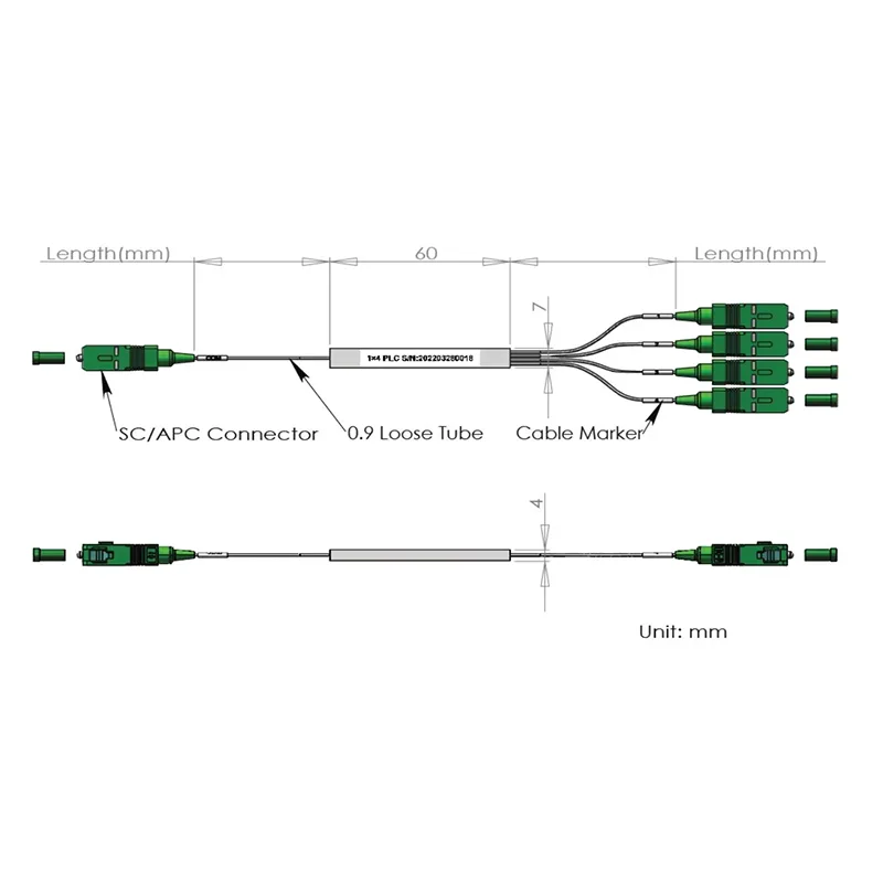 I-1x4 / 1 × 8 I-PLC Splitter Tube Tube Package engu-60x7x4mm, nge-900μm evulekile tube 1 + 0.1 / -0M, SC / APC Isixhumi.